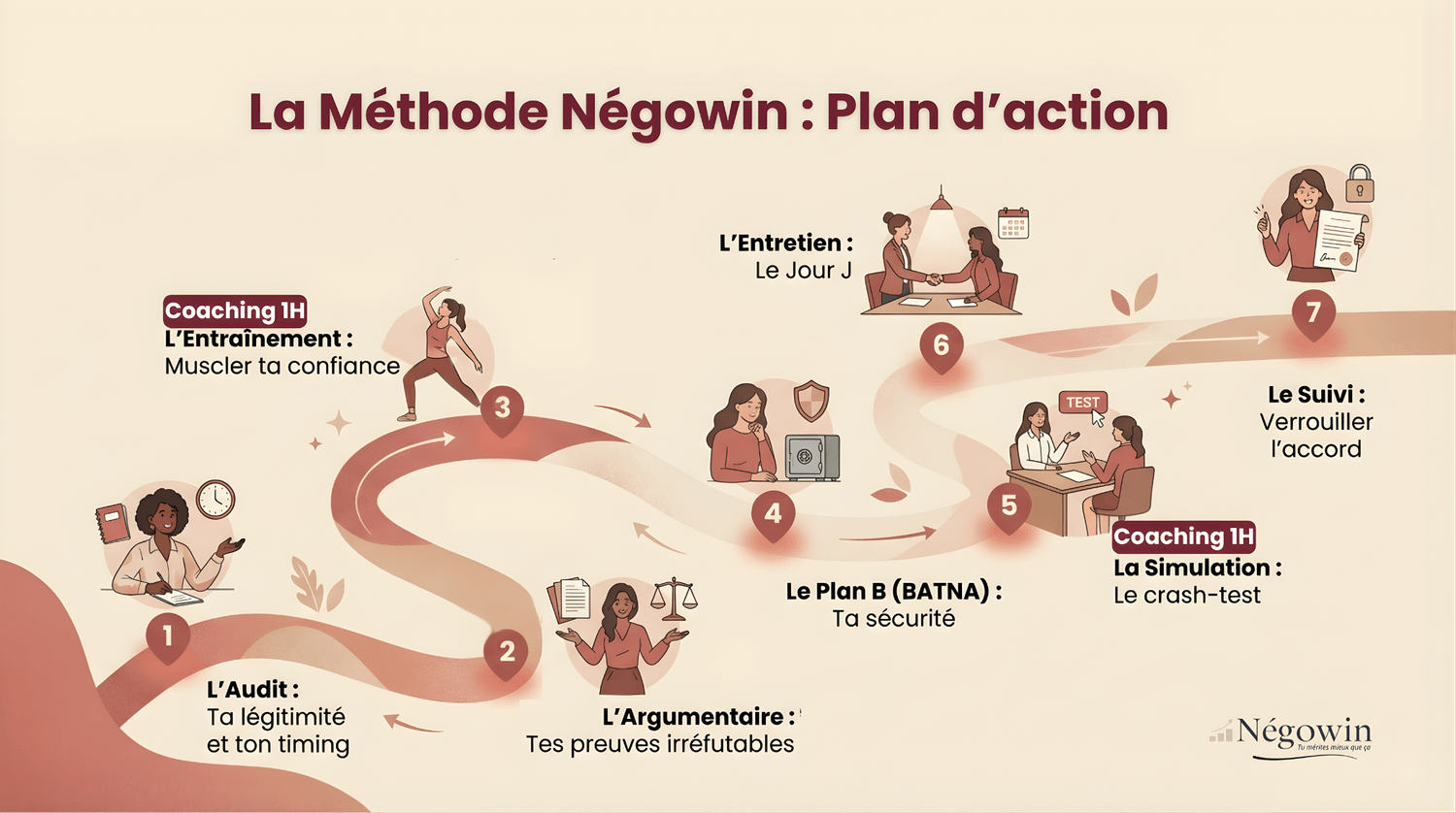 Pour optimiser ta préparation et te permettre d’obtenir une hausse significative de ta rémunération, nous te proposons la méthode Négowin. C’est un processus structuré en sept étapes, qui vise à transformer une simple demande d’augmentation en une proposition de valeur professionnelle pour l'entreprise et l’employeur.